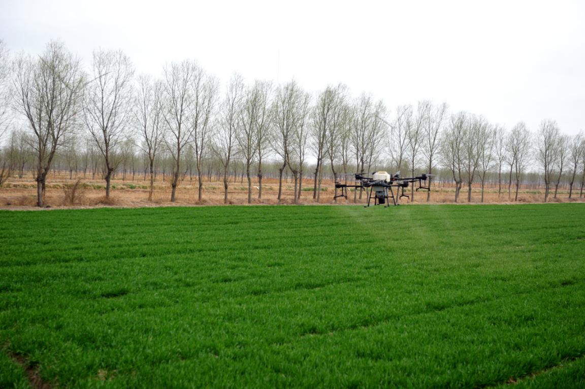 在田間的一頭,華豐公司的植保無人機“飛手”正在進行“飛防”作業,確保了農田生產安全,相比傳統人工打藥防治,每畝地的勞動力、藥品成本可降低45%。