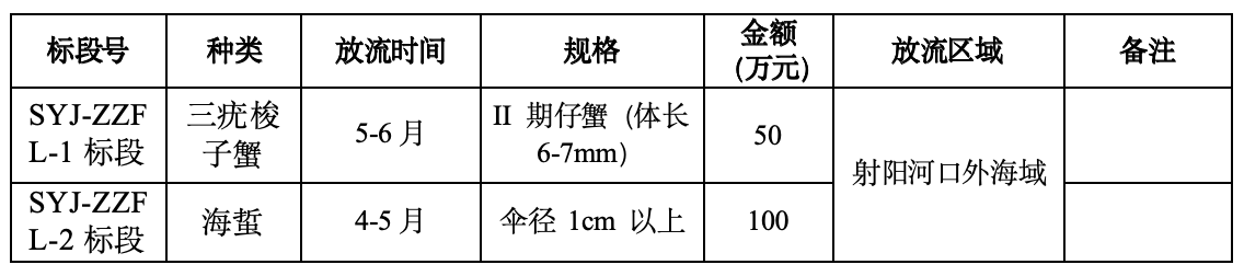 ①SYJ-ZZFL-1標段:包括三疣梭子蟹的人工增殖放流,采購費為50萬元。