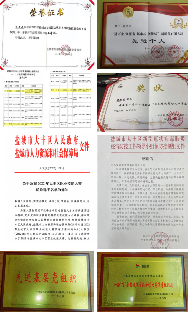 2022年,文旅集團黨總支和港泊半島酒店支部被評為“先進基層黨組織”。文旅集團洪兵、韓世軍在鹽城港集團“七一”表彰中獲評優(yōu)秀共產(chǎn)黨員稱號,蔣雷獲評優(yōu)秀共青團員稱號。港泊半島酒店職工張曉芳、湯以新、蔣慧等同志分別獲得大豐區(qū)技能狀元、鹽城市技術能手、大豐區(qū)五一勞動獎章、大豐區(qū)青年崗位能手、大豐區(qū)巾幗建功標兵稱號。