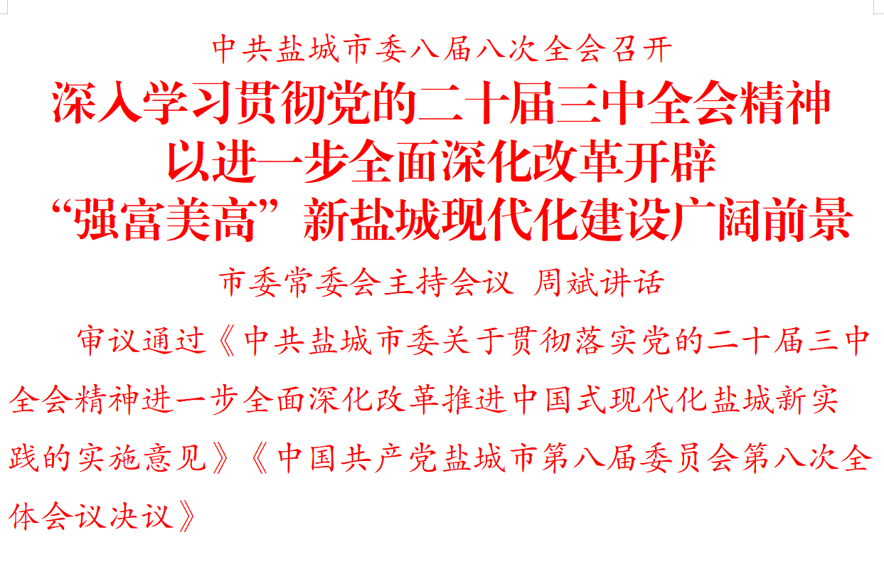 9月15日,中國共產黨鹽城市第八屆委員會第八次全體會議召開。全會深入學習貫徹黨的二十屆三中全會精神和習近平總書記對江蘇工作重要講話精神,按照省委全會部署,動員全市上下堅持以習近平新時代中國特色社會主義思想為指導,全面準確把握中央要求,更加堅定自覺將改革進行到底,以進一步全面深化改革實際成效,開辟“強富美高”新鹽城現代化建設廣闊前景。