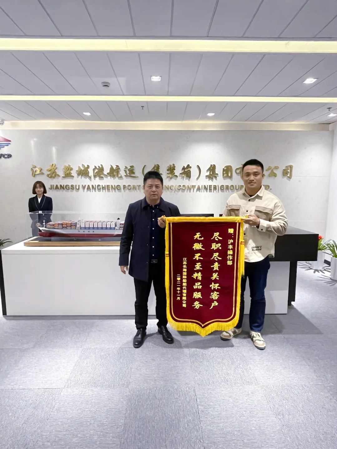 11月12日,江蘇長海國際船舶代理有限公司業(yè)務經(jīng)理吳長春一行拜訪江蘇滬豐集裝箱物流有限公司,將一面寫有“盡職盡責關懷客戶,無微不至精品服務”的錦旗送到滬豐公司,對滬豐公司操作部近年來提供的優(yōu)質高效服務表示感謝。