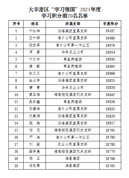 新的一年,為表彰先進、激勵后進,持之以恒地提高港區(qū)全體干部職工的學(xué)習(xí)自覺性和主動性,進一步加強學(xué)習(xí)型黨組織建設(shè)。近日,大豐港區(qū)舉行“學(xué)習(xí)強國”2021年度先進個人頒獎儀式,根據(jù)“學(xué)習(xí)強國”APP大豐港區(qū)年度學(xué)習(xí)積分排名,對成績突出的前20名“學(xué)習(xí)達人”代表進行了表彰,并頒發(fā)榮譽證書。