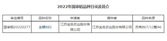 根據農業農村部公告第625號公布農作物新品種審定名單,江蘇金色農業股份有限公司自主選育的水稻新品種金粳882名列其中,同時也是該公司第三個自主選育的水稻新品種。