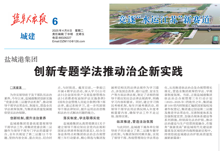 與此同時,鹽城港下屬各單位領導班子同步建立了第二議題專題學法機制,與集團保持同頻共振,實現了領導干部、各級管理崗位學法常態化,從而推進依法治企及合規管理長效化,營造全集團濃厚的學法、學規章制度氛圍。當前,正值鹽城港集團依法治企合規管理三年行動計劃(2023—2025年)的收官之年,集團最新100項內控制度匯編獲國家版權局著作權登記,集團通過創設第二議題及推進學法常態化、完善制度體系及加強制度宣貫、加強合規體系建設等系列措施,持續深化法治護航,推動法治建設與生產經營深度融合,在服務“強富美高”新鹽城現代化建設新篇章及區域經濟向海圖強新征程中,持續繪就鹽城港法治護航高質量發展嶄新篇章。