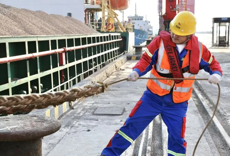 帶纜工人在碼頭前沿緊握纜繩