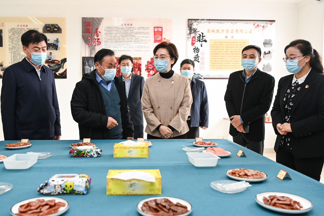 鄉村要振興,產業必興旺。江蘇震洲五醍漿酒業有限公司歷史悠久,底蘊深厚。徐纓走進車間一線,和企業負責人深入交流,勉勵傳承非遺文化,增強核心競爭力,推介提升品牌形象,不斷做大做強做優。在濱海縣中央廚房凈菜配送中心,徐纓認真察看食材來源、菜品加工等情況,叮囑要提升聯農帶農本領,嚴格全流程精細管理,強化食品安全管控,提升學生就餐滿意度,真正把民心工程做細做實做好。凱興食品有限公司集肉制品研發、生產、銷售于一體,產品深受市場歡迎。徐纓要求發揮好鹽城農業強的優勢,強化產業鏈協同聯動,實現又好又快發展。